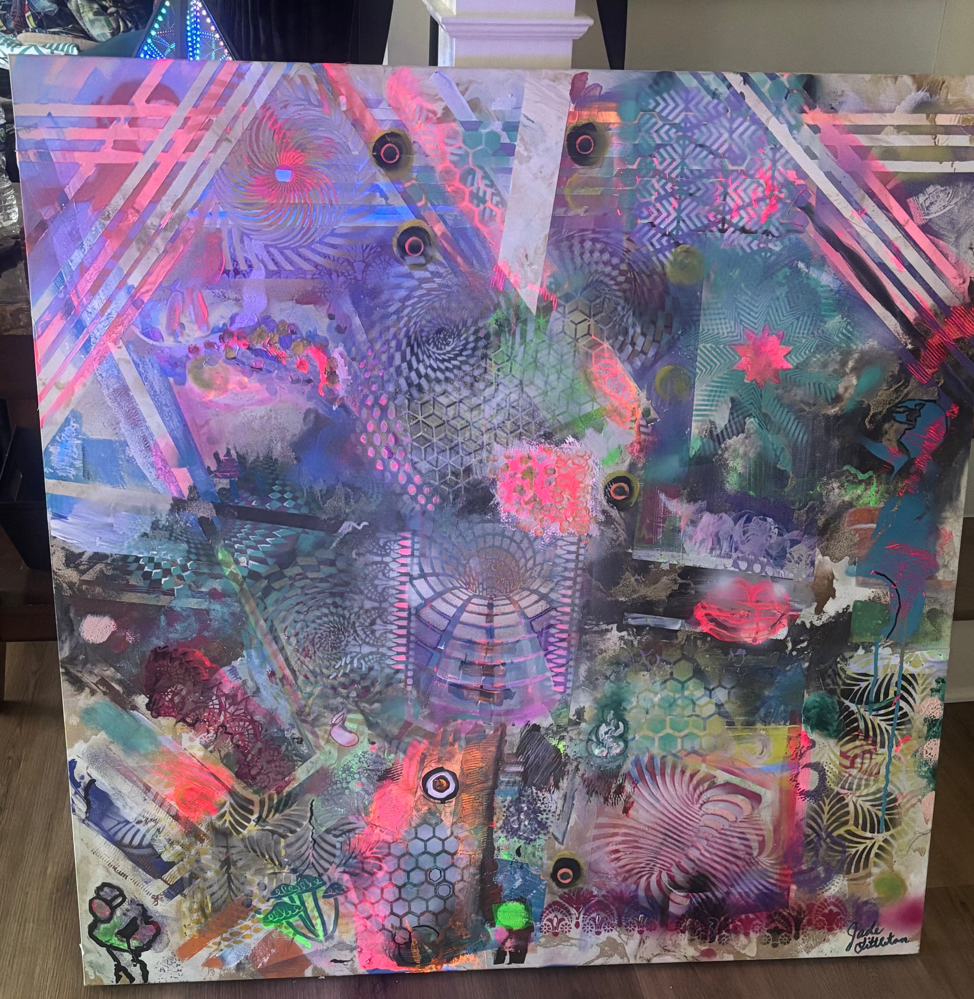 This radiant mixed media work is a kaleidoscopic journey through layered geometry, organic forms, and bursts of neon vibrancy. Intricate stencil work—spirals, hexagons, feathers, and fractal blooms—create a multidimensional tapestry that feels alive with movement. Hidden imagery and abstract symbols invite viewers to discover something new with each glance.