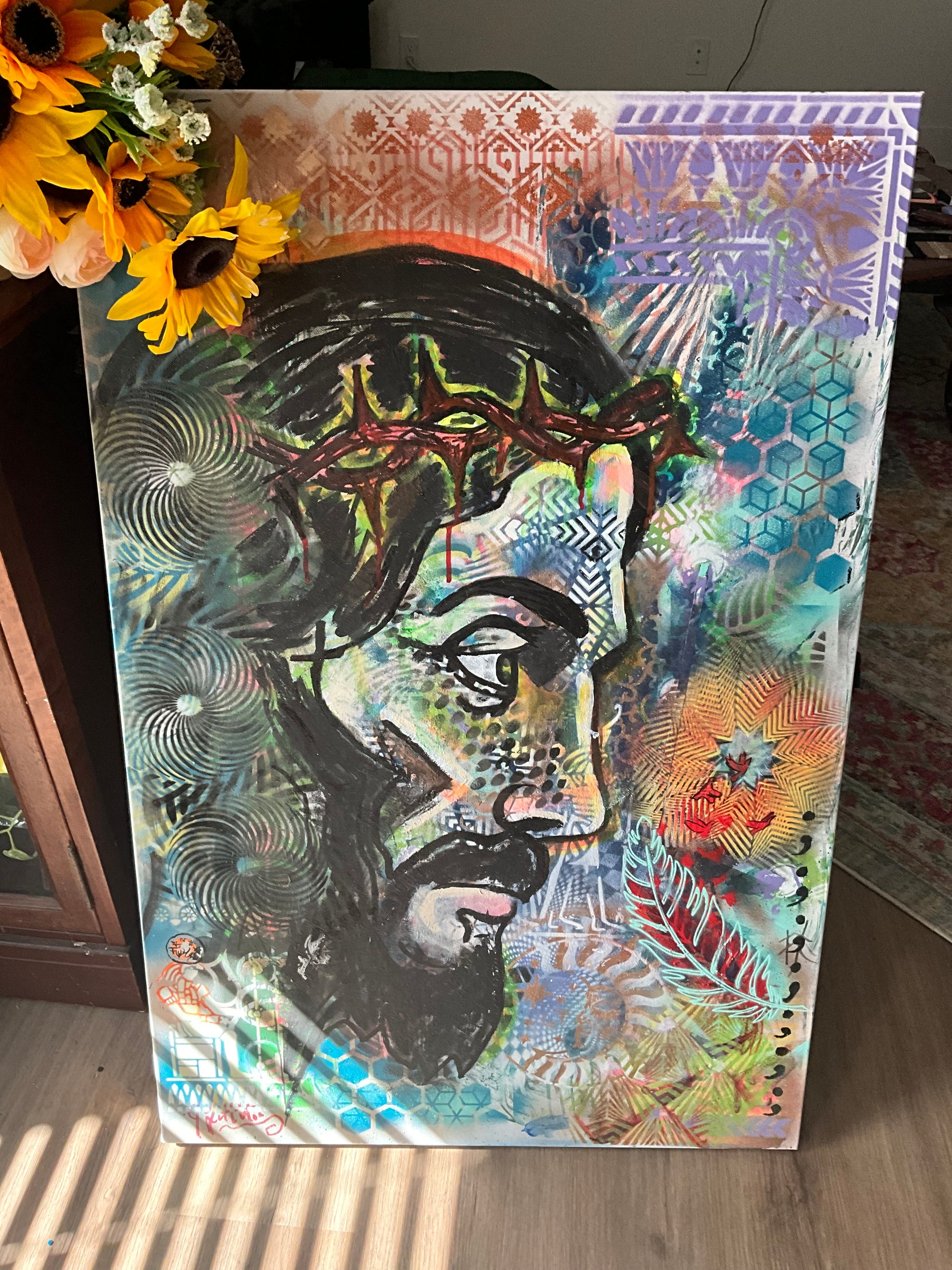 The composition merges street art influences with sacred iconography, creating a dialogue between the temporal and the eternal. The layering of colors—fiery oranges, serene blues, and earthy greens—evokes both suffering and transcendence, inviting viewers to contemplate themes of sacrifice, resilience, and hope. There are hidden sigils in UV reactive paint. The piece was created using sound therapy, meditation, and intention.