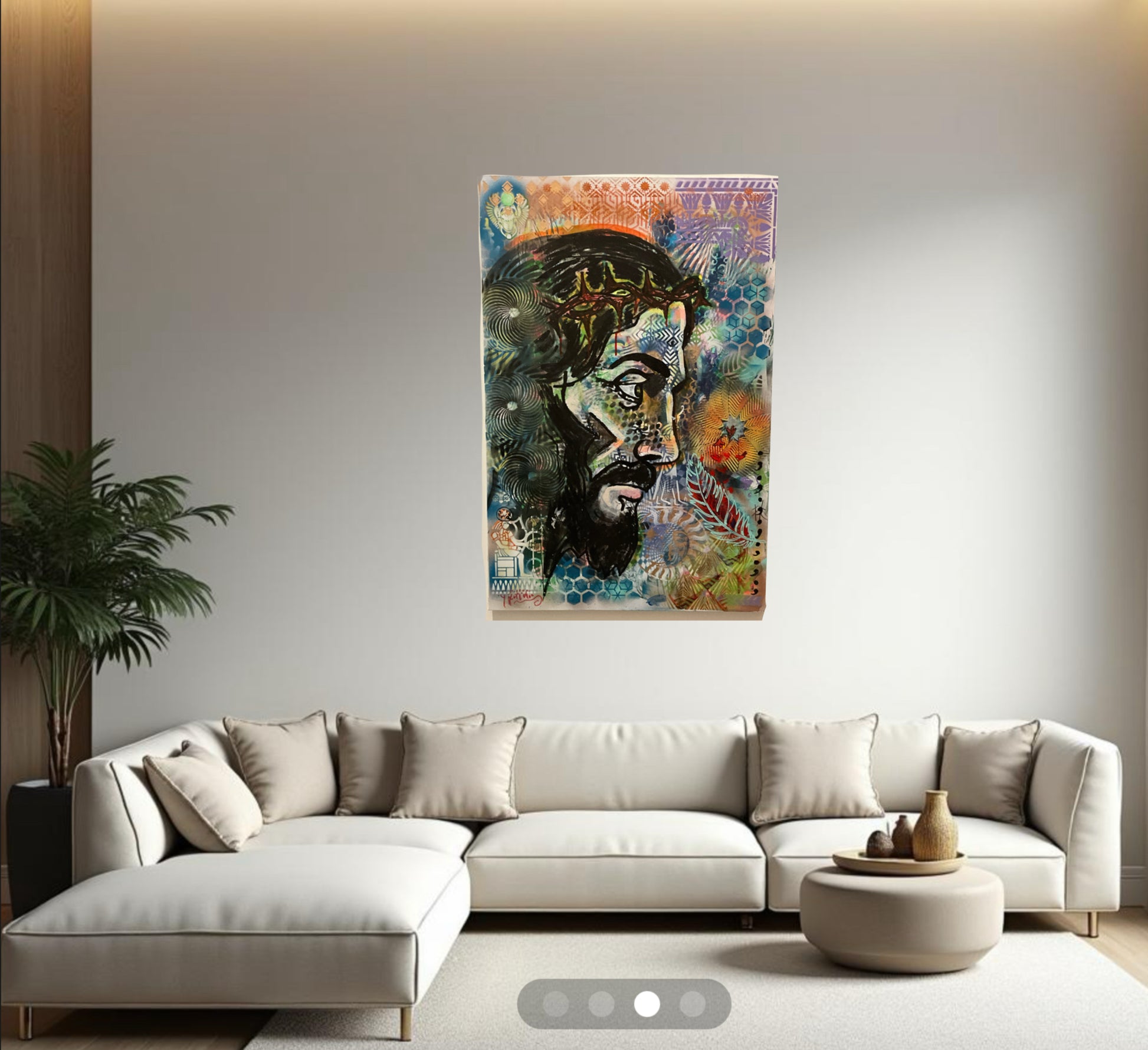 This striking mixed media portrait of Jesus blends bold, expressive brushwork with intricate geometric stencils and layered textures. The crown of thorns, rendered in deep crimson and vivid green, draws the eye to His solemn yet compassionate expression. Surrounding His profile, an explosion of patterns—honeycomb grids, spirals, feathers, and radiating mandalas—symbolizes divine energy, spiritual awakening, and the interconnectedness of all creation.