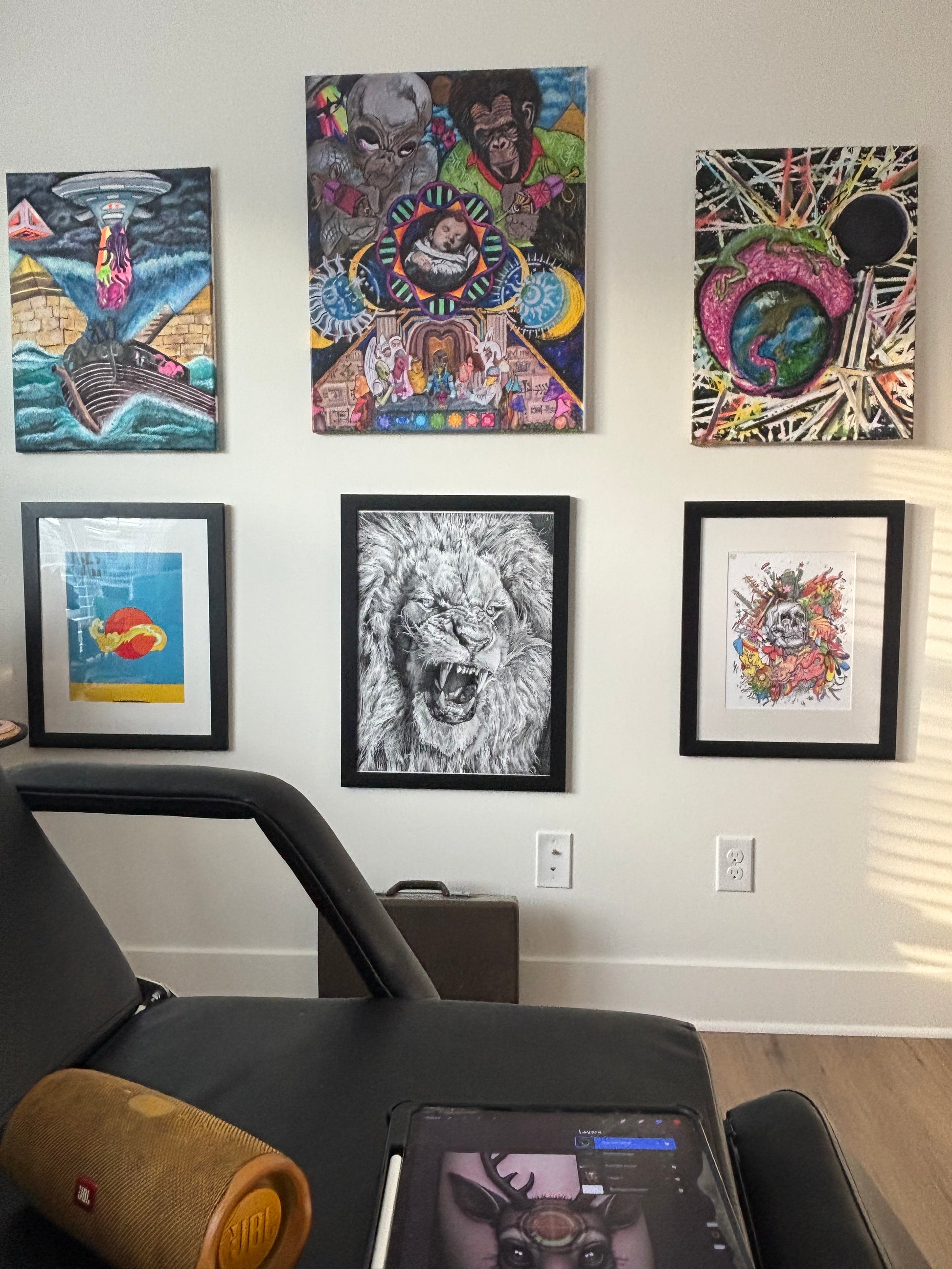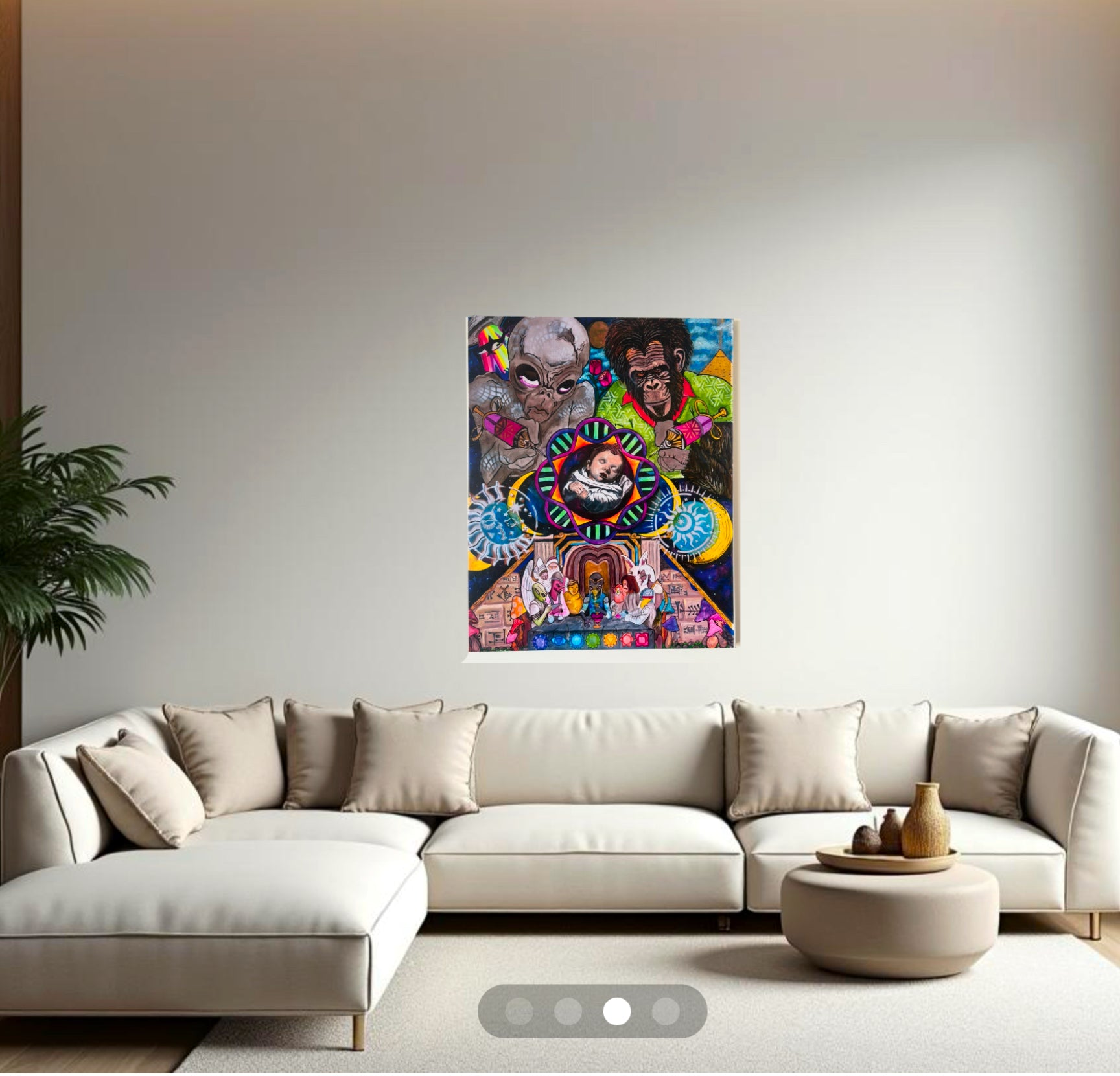 Rich in color and layered with symbolic references, the piece merges science, myth, and esoteric lore into a singular vision — a meditation on creation, ancestry, and the cosmic interconnectedness of all life.