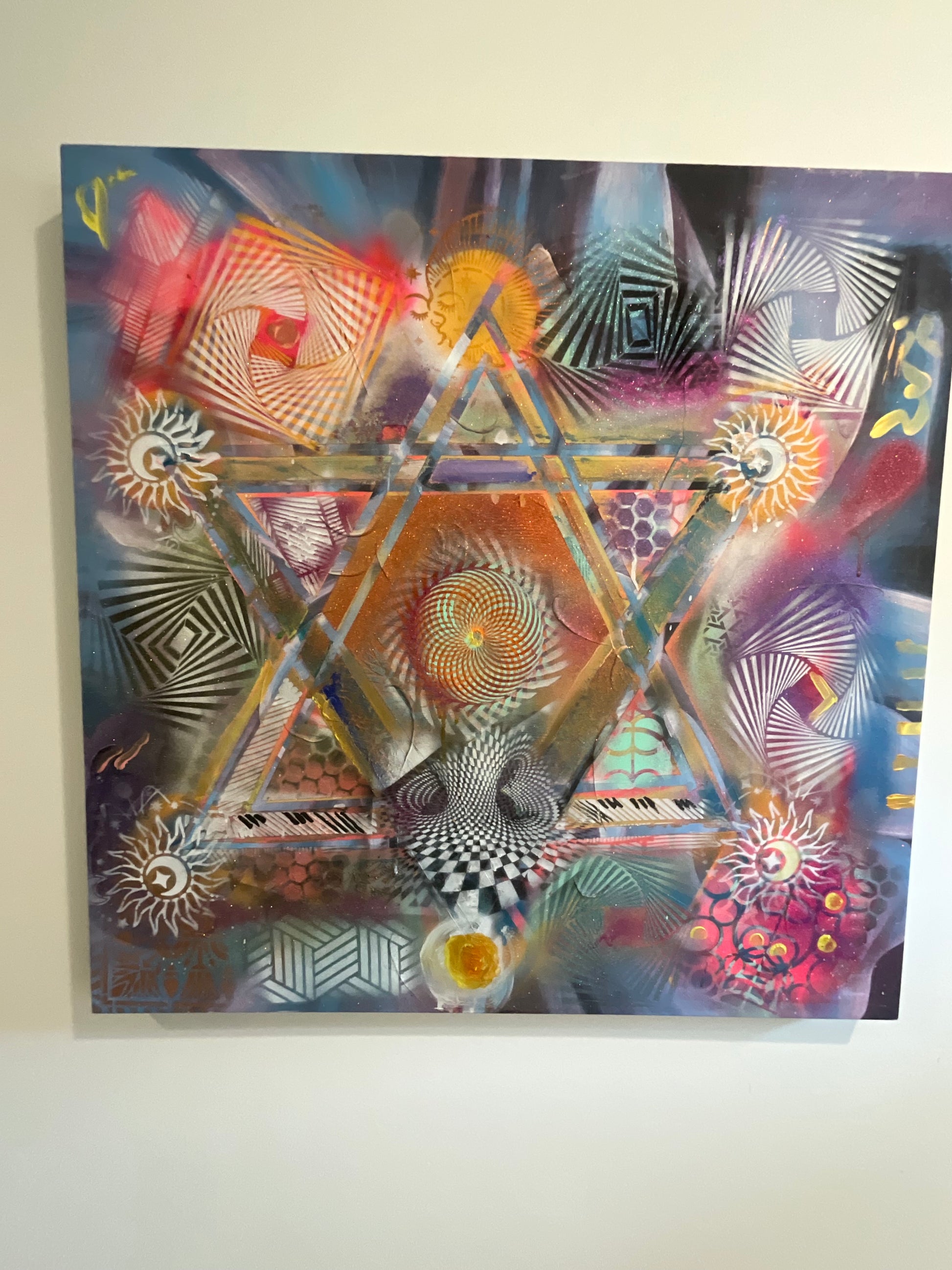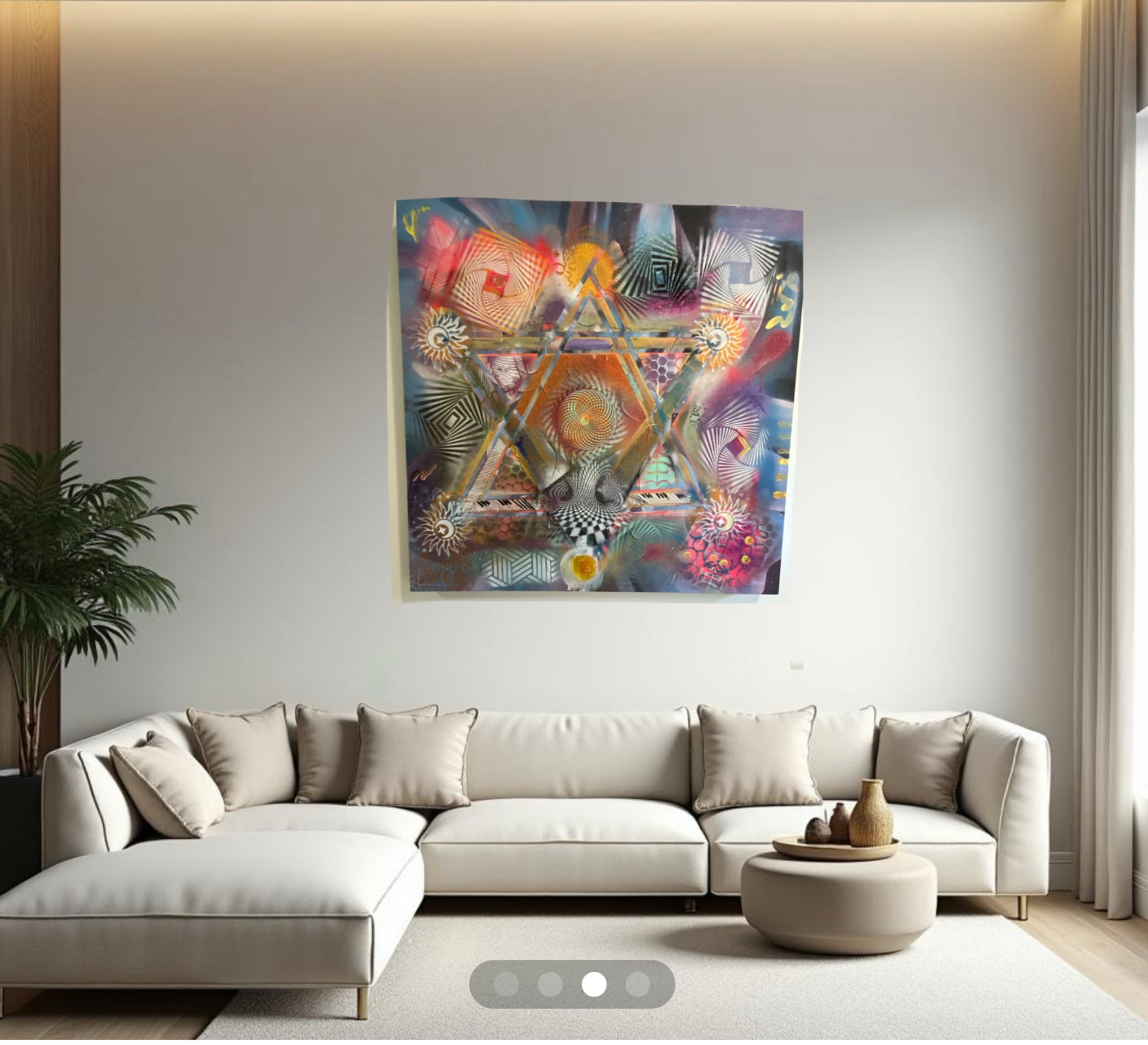 Exploding with color, pattern, and cosmic symbolism, Stellar Geometry invites the viewer into a portal of sacred mathematics and boundless imagination. At the center, a radiant six-pointed star — merging upward and downward triangles — anchors the composition, symbolizing the union of opposites: spirit and matter, light and shadow, the infinite and the embodied.
