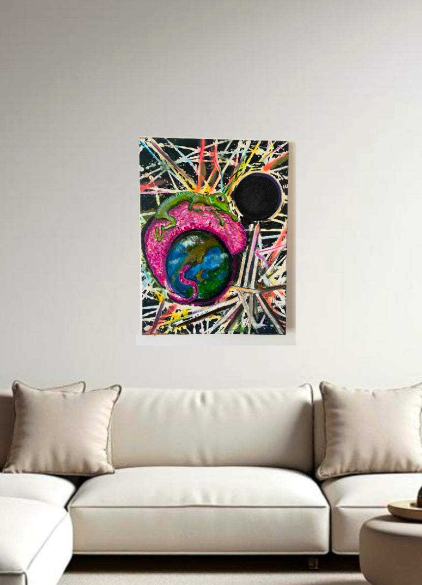 3 of 3: In The Reptilian, a vivid green gecko clings protectively to a textured, pink, brain-like form encircling the Earth. Its gaze is unblinking, almost sentient, as if safeguarding the planet from unseen forces. Behind this surreal tableau, streaks of neon and white explode outward against a black void, evoking both cosmic energy and frenetic urgency.